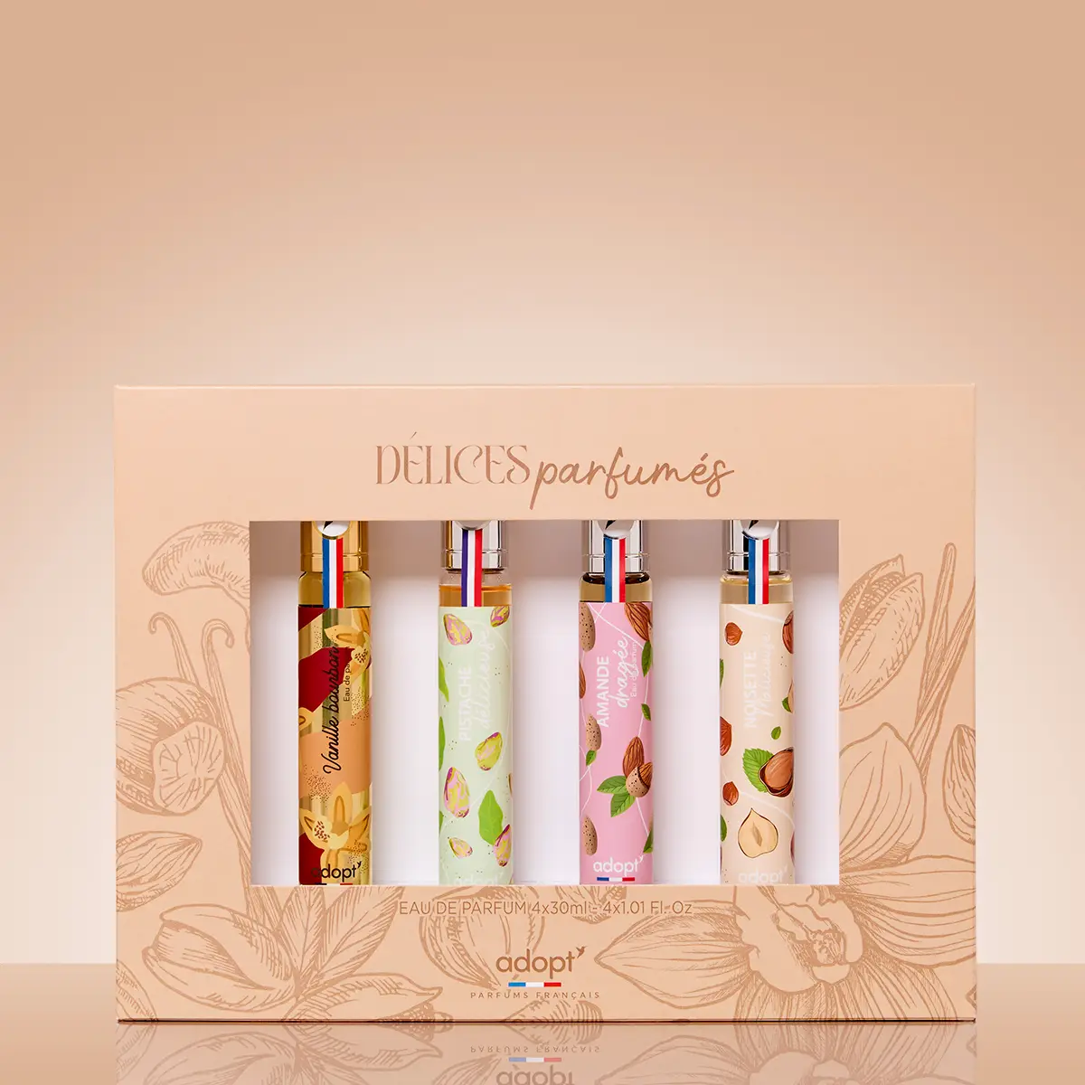 Succombez à un tourbillon de douceur avec Délices Parfumés, un coffret irrésistible de 4 eaux de parfum aux notes intensément gourmandes.