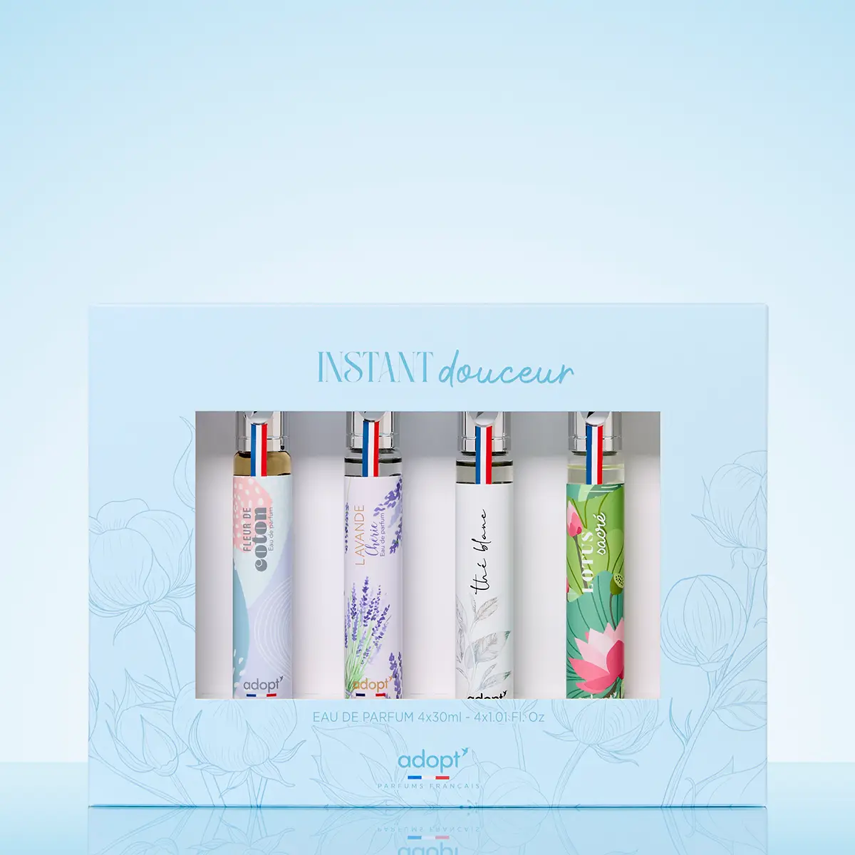 Offrez-vous une parenthèse de sérénité avec Instant Douceur, un coffret réunissant quatre eaux de parfum aux accords floraux et musqués.