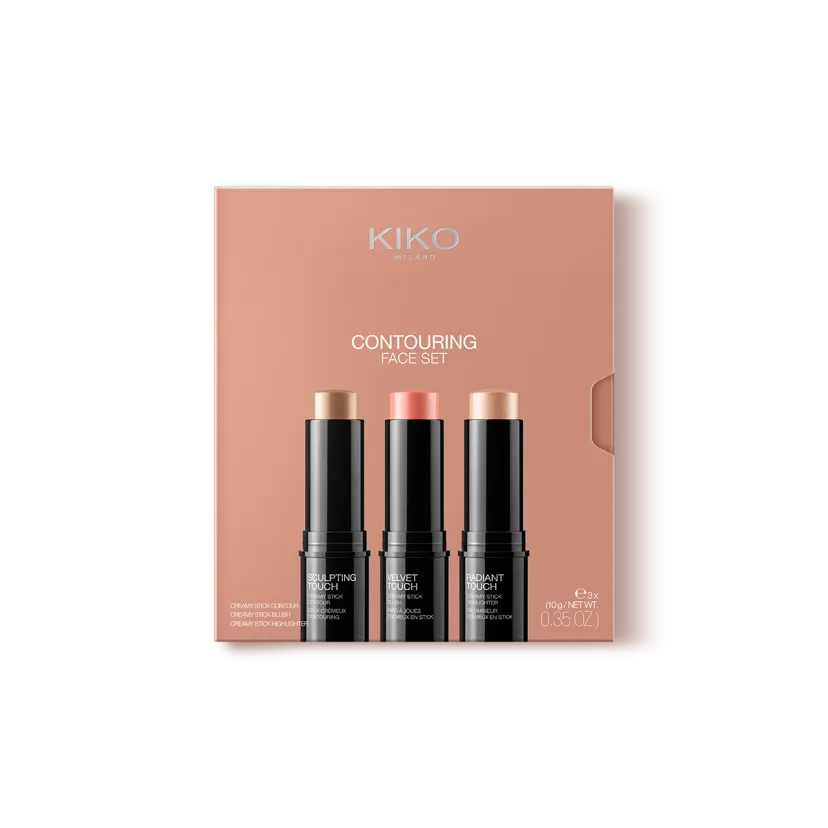 Ce kit de maquillage, composé d’un blush, d’un enlumineur et d’un stick contour, est présenté dans un élégant packaging en carton.