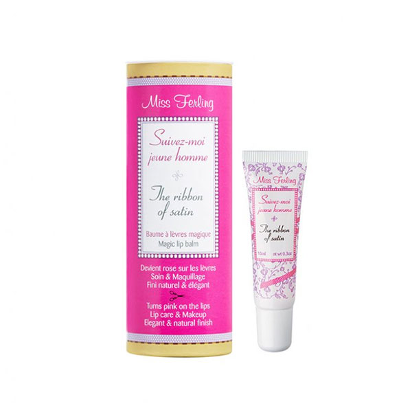 Ce baume hybride qui réagit au pH des lèvres tient son nom du ruban que l’on mettait à son chapeau et qui flottait au vent, comme une invitation à être suivie. Le Suivez-moi jeune homme rappelle cet accessoire désuet car il donne l’impression de déposer un ruban de satin rose sur les lèvres.